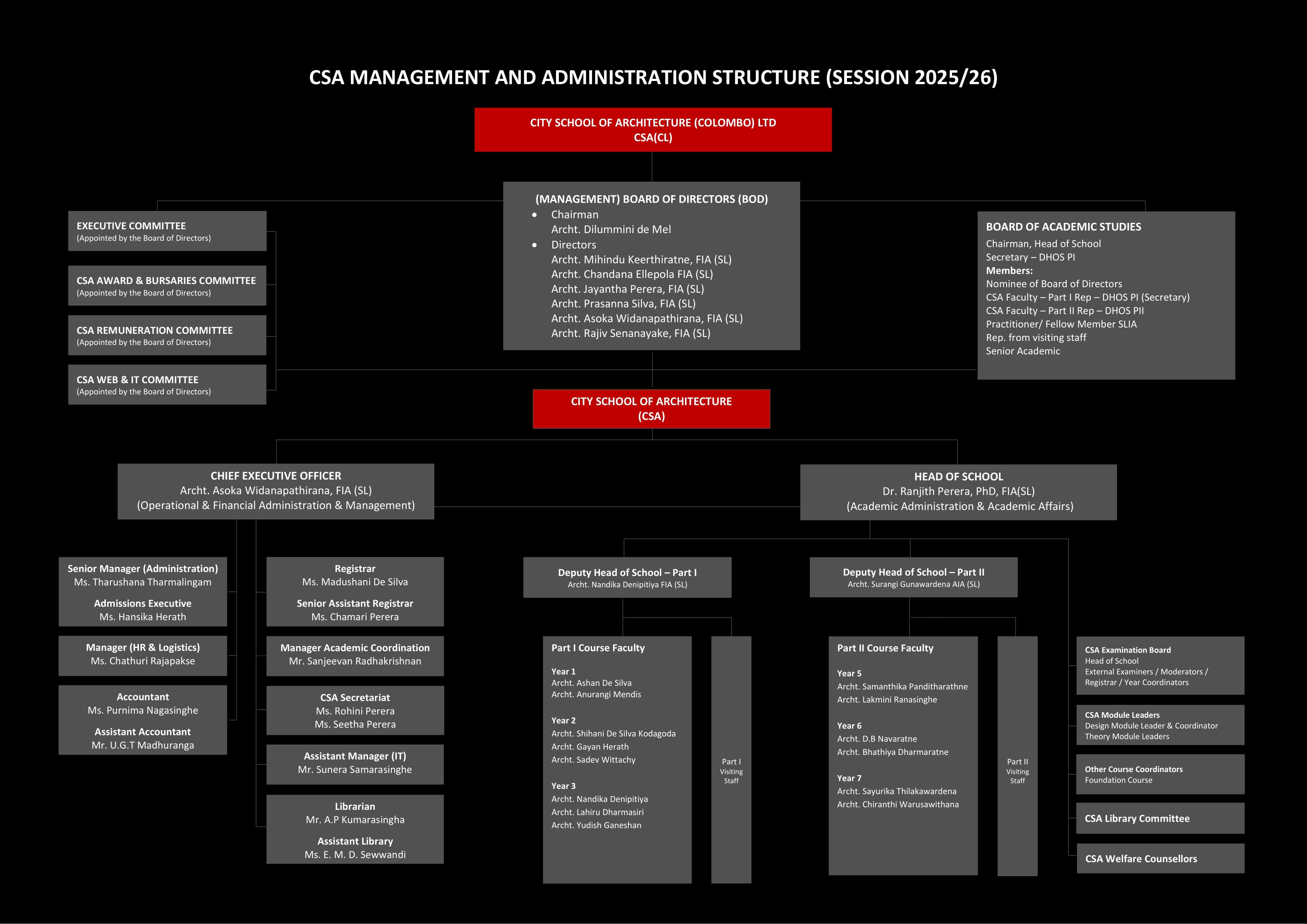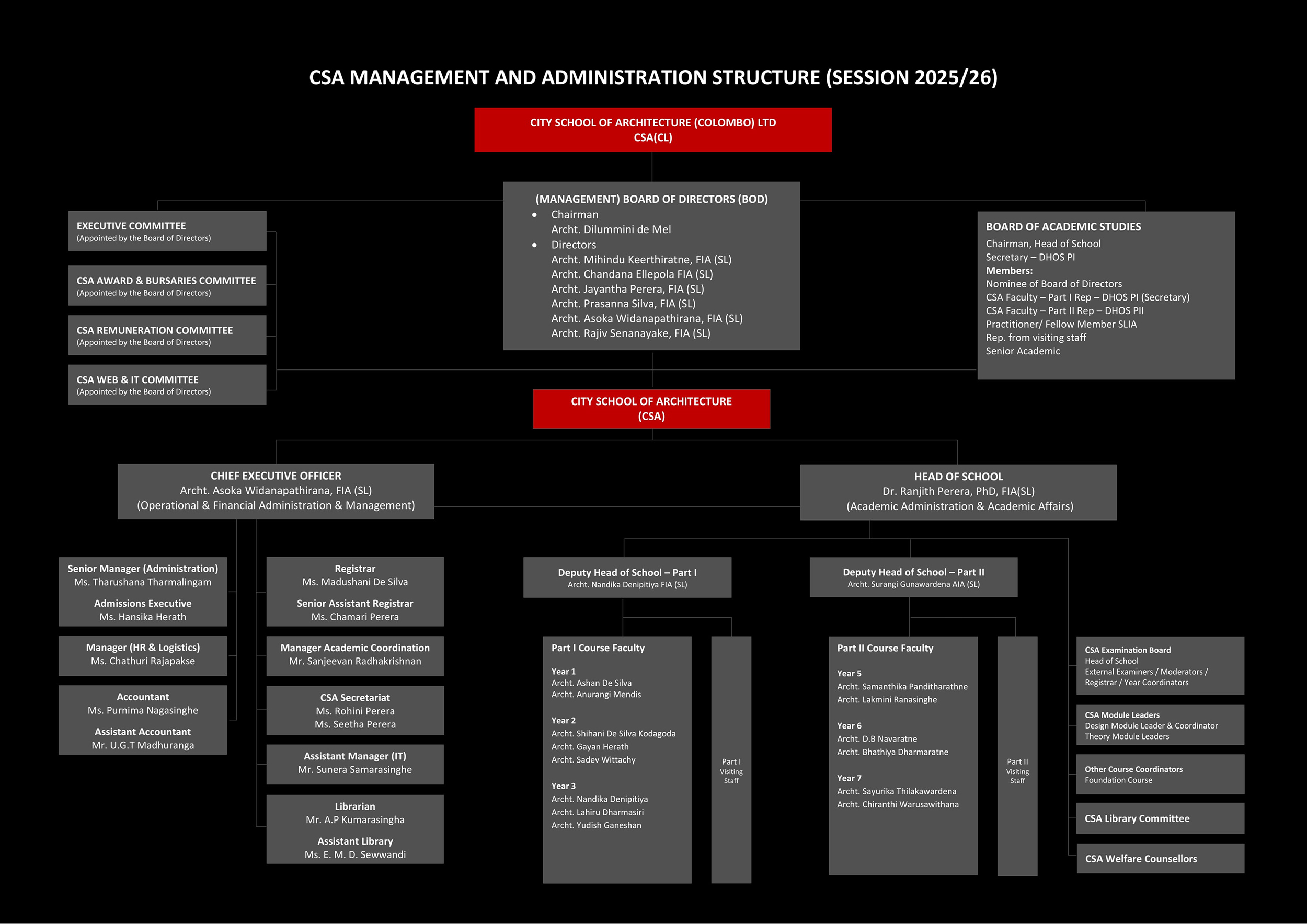 This shareholding mechanism ensures that ownership and governance of the CSA remain within the architectural profession, thereby guaranteeing that governance is in accordance with the Sri Lanka Institute of Architects (SLIA) Charter ideals.