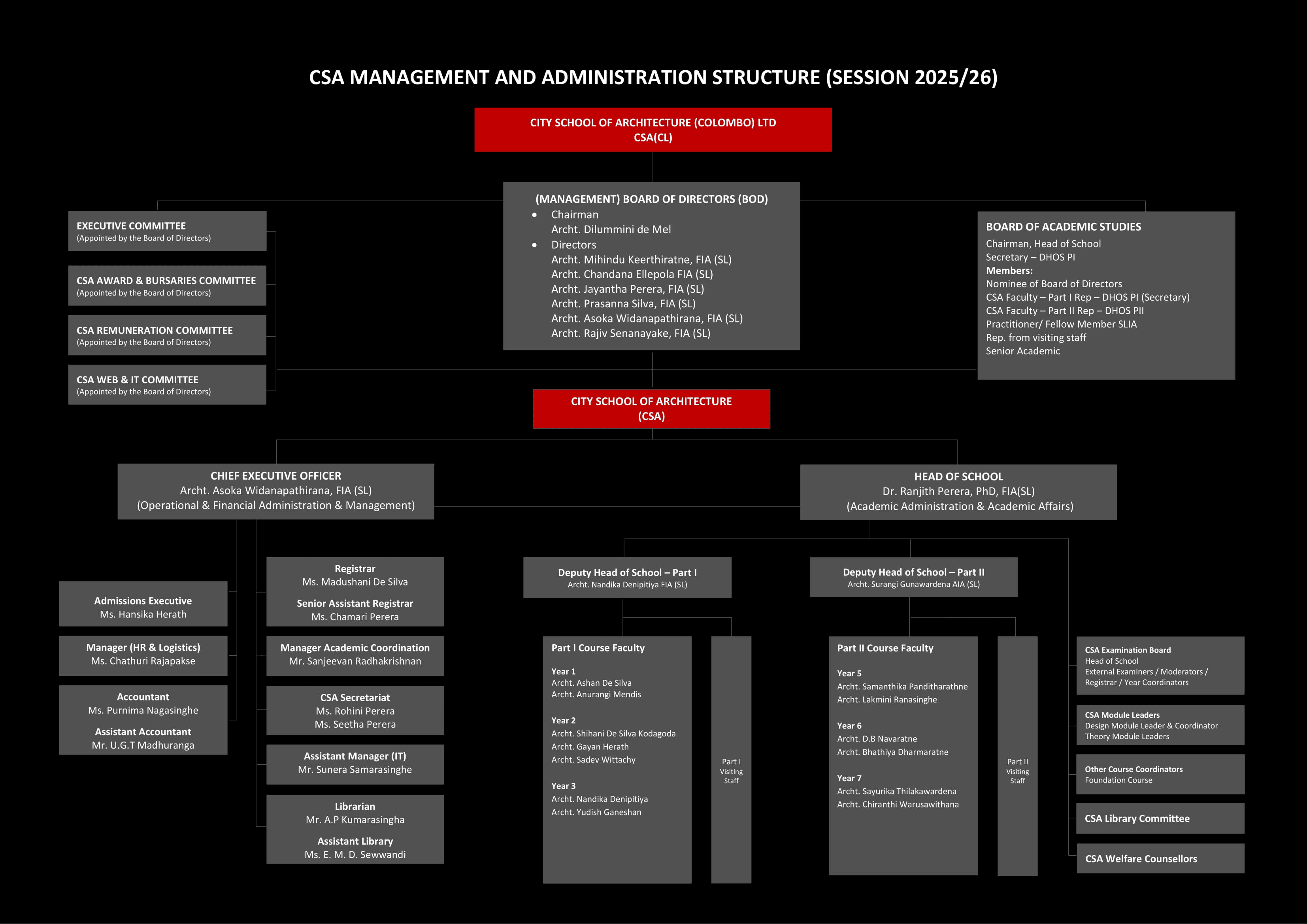 This shareholding mechanism ensures that ownership and governance of the CSA remain within the architectural profession, thereby guaranteeing that governance is in accordance with the Sri Lanka Institute of Architects (SLIA) Charter ideals.